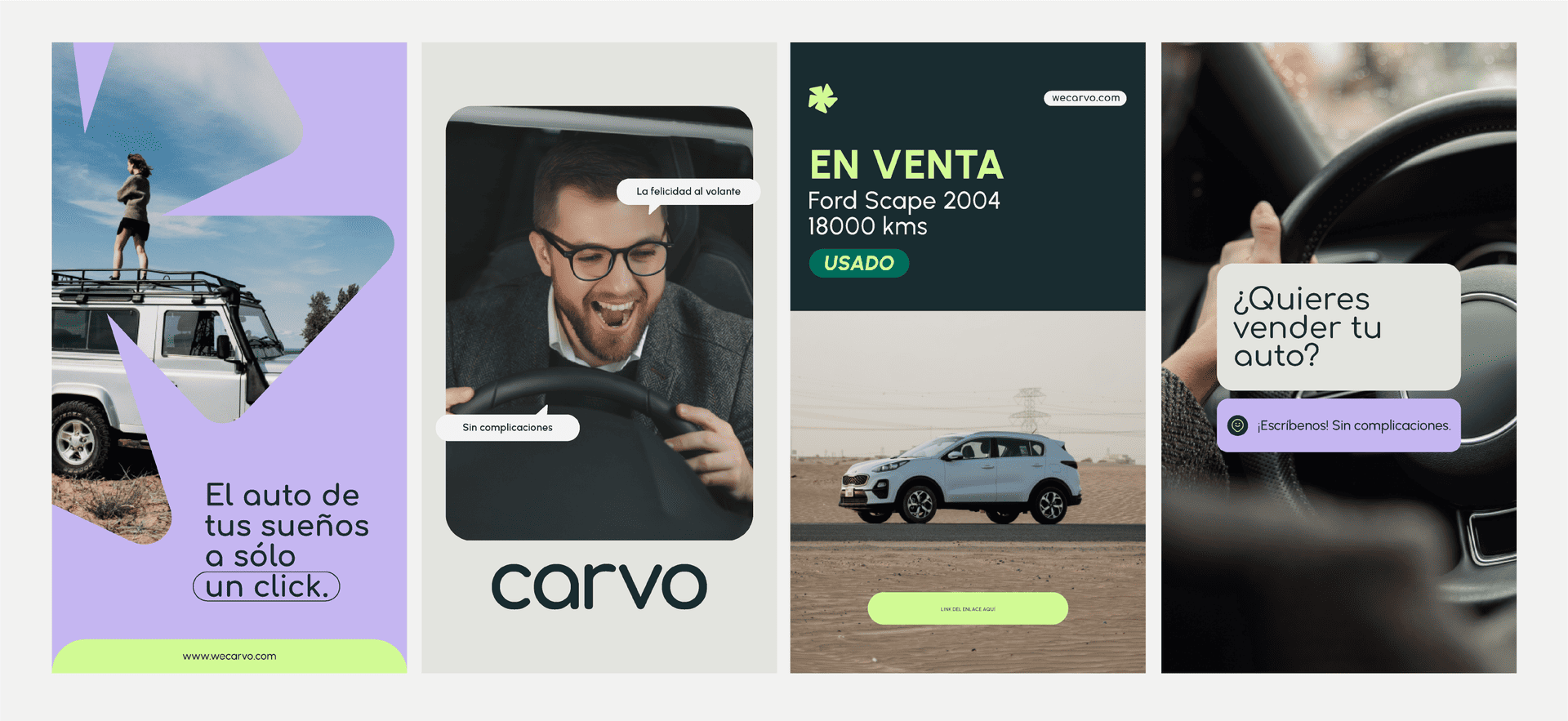Desde una mirada estratégica construimos una nueva marca desde cero: exploramos el mercado, definimos su nuevo posicionamiento, creamos el naming CARVO, su tagline “Tu auto sin complicaciones”, el tono de voz y un sistema visual 100% digital-first. La marca fue pensada para ser ágil, moderna y disruptiva, con guiños visuales y verbales inspirados en el mindset de Silicon Valley.